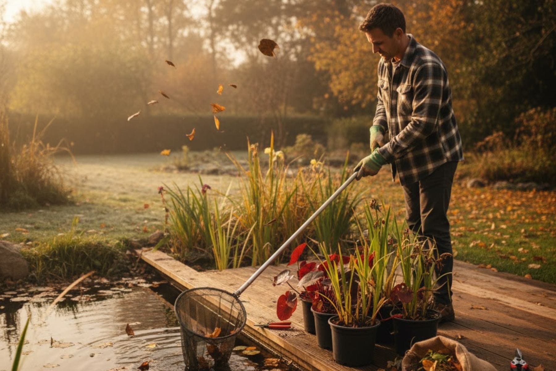 - Przygotowanie oczka wodnego: Usunięcie mułu i liści z dna, wyjęcie pomp i filtrów oraz przygotowanie przerębla na zimę.
